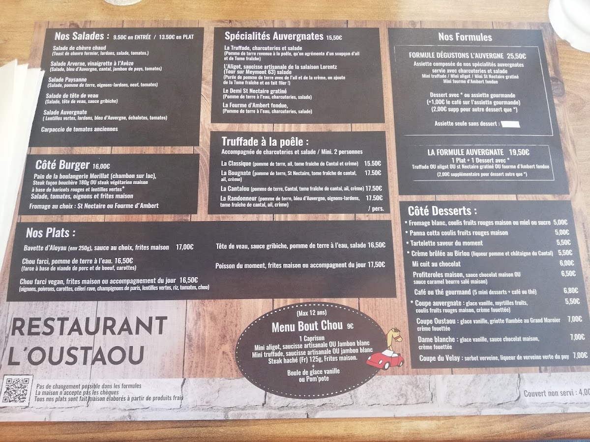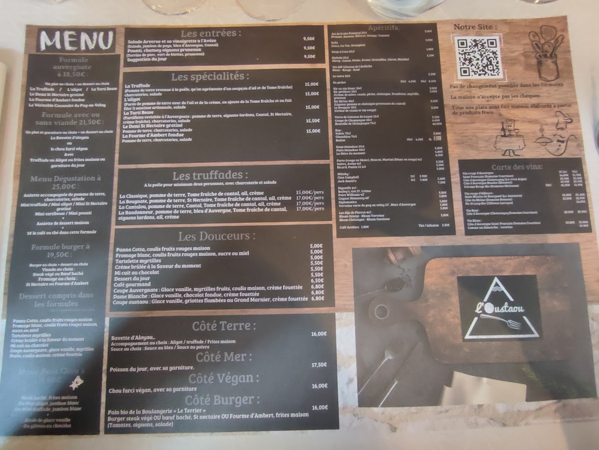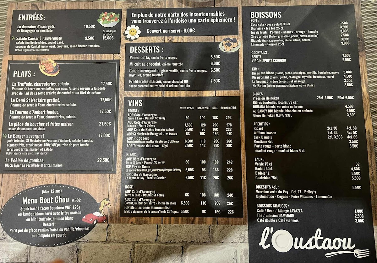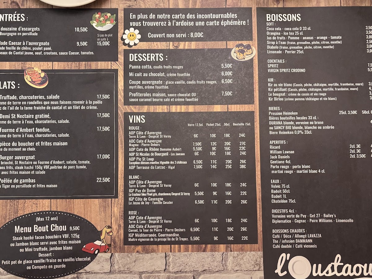 Welcome to L'Oustaou, a charming restaurant nestled at 18 Rue Notre Dame in Besse-et-Saint-Anastaise, France. Here, you are invited to savor a menu that celebrates local cuisine, offering a delightful variety of dishes that resonate with the region's culinary heritage.